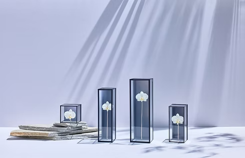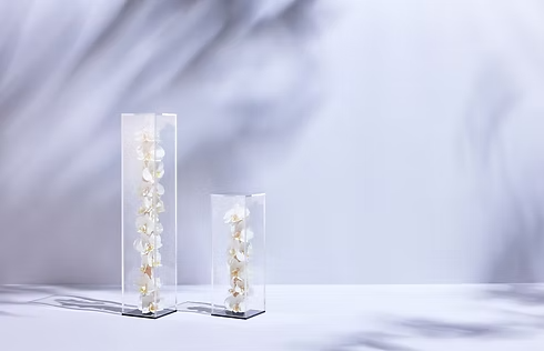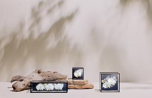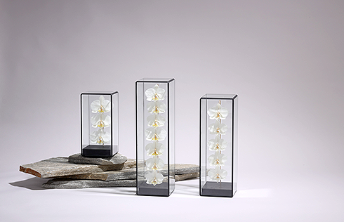 花をふんだんに使用した本シリーズは、生花の胡蝶蘭の持つような迫力や壮大さを表現しています。一方、設置面積は10㎝×10㎝と省スペースでも飾っていただけるのが魅力です。計3シリーズを展開。